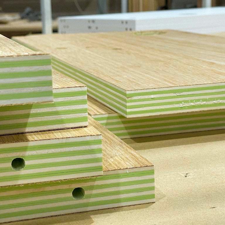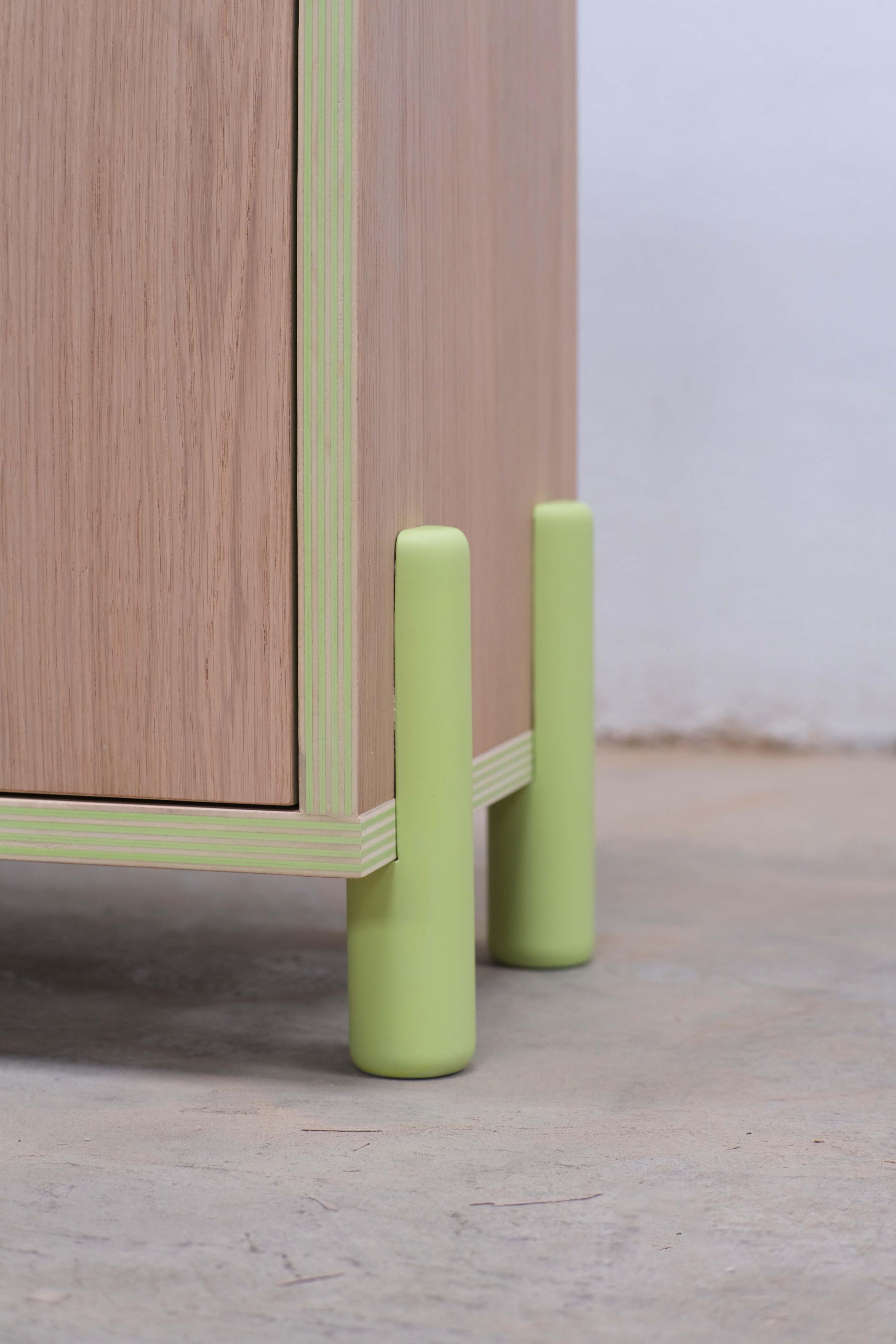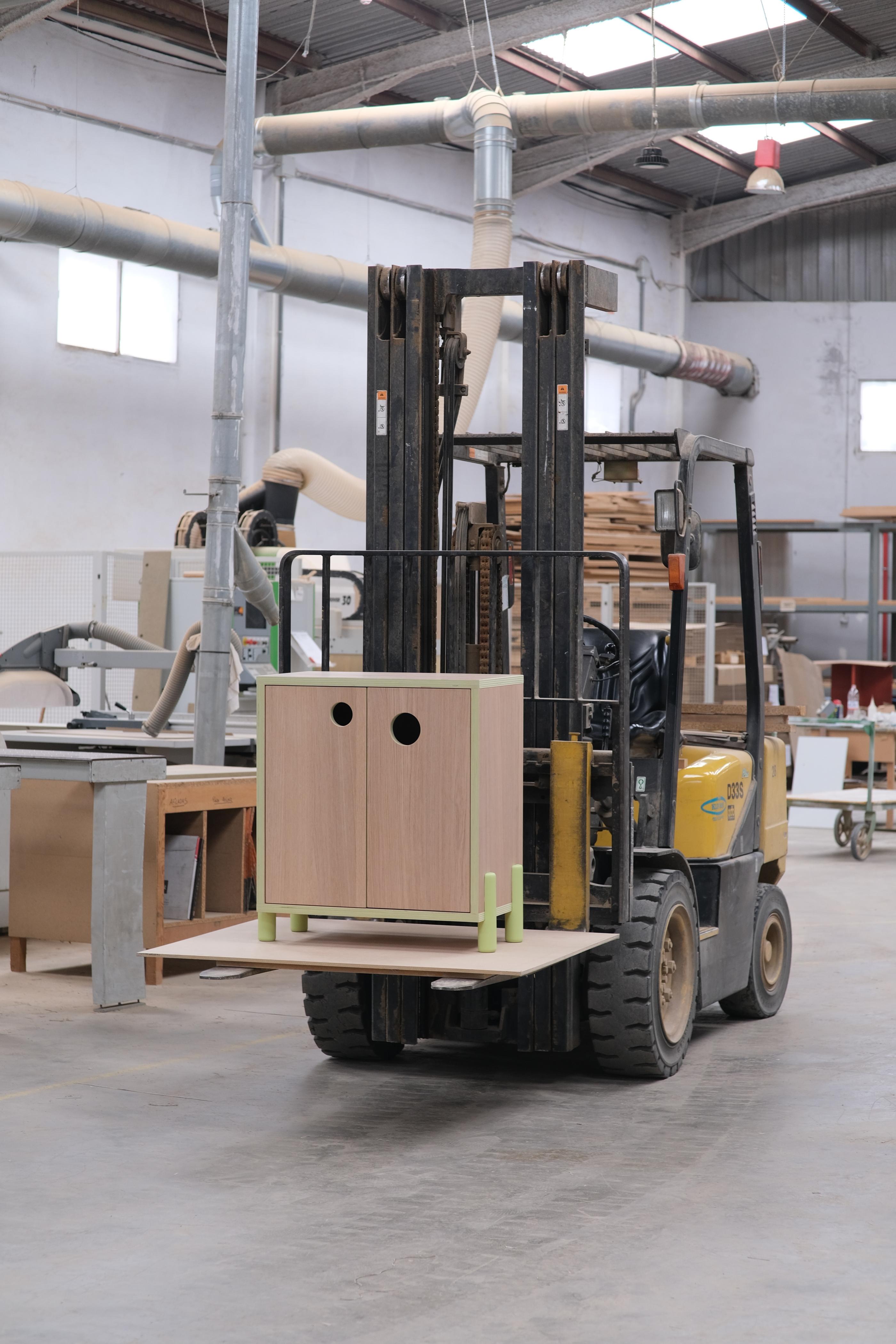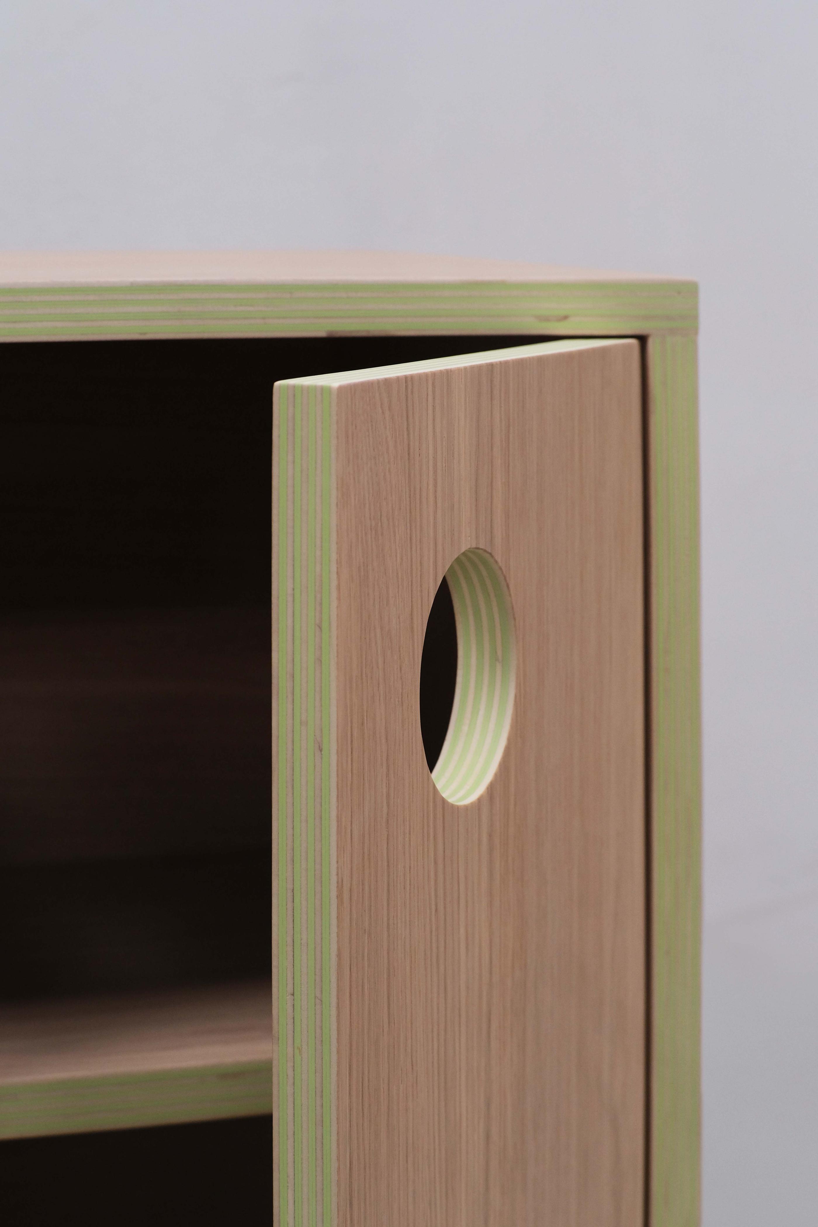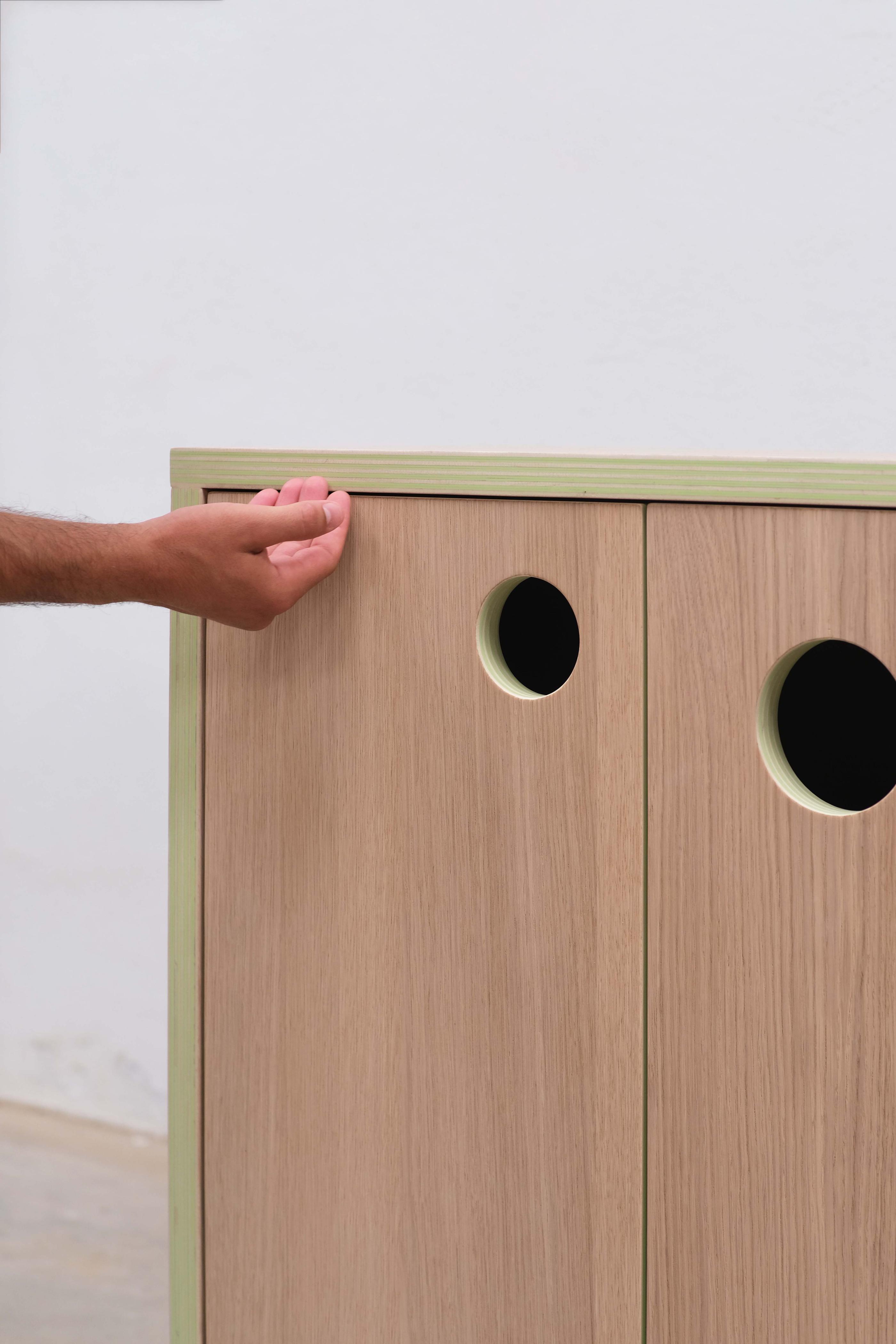 To highlight the creation of the plywood: thickness of 25 mm made with 5 recycled poplar boards and 4 Formica sheets and veneered in European oak. The colour of the Formica and the finishes can be customised to the user's taste.